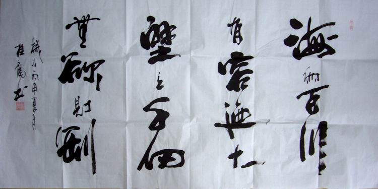 第一字画网的四尺书法,郁桂龙老师这幅四尺是适合办公室挂的字,气派非凡,笔法老练,内容为:海纳百川、有容乃大,壁立千仞、无欲则刚,装裱后尺寸达到1.8米长,如果放在画廊出售,湖北书法家郁桂龙老师这幅四尺书法的价格在1500元左右。