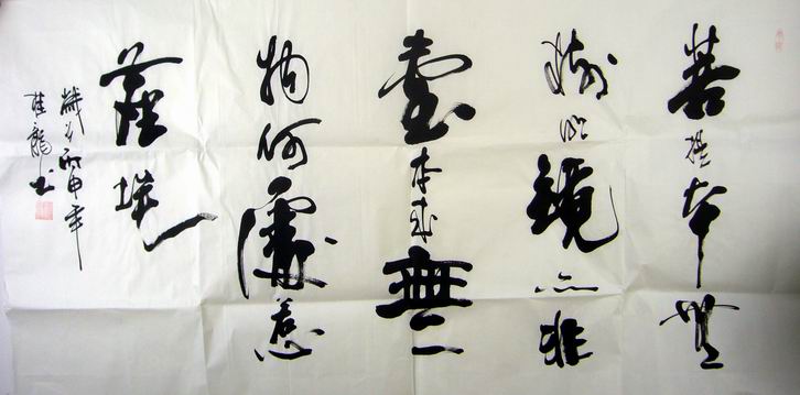 第一字画网的菩提本无树书法,是幅适合挂在书房或客厅的书法内容,也适合挂在公司的办公室,作品的内容出自佛教典故,内容为:菩提本无树明镜亦非台;本来无一物,何处惹尘埃?这幅书法是湖北书法家协会郁桂龙老师的作品,装裱后长度约在1.8米左右,作品笔法老练,如果放在画廊出售,郁桂龙老师此幅菩提本无树书法的标价大约在1500元左右。