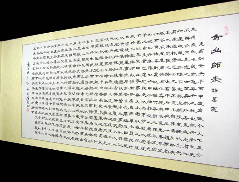 第一字画网的四尺前出师表书法,已完成装裱。这幅书法作品前出师表裱后尺寸达到1.8米长,从这幅书法诸葛亮传世名篇前出师表中看出作品笔法老练,清新秀丽,如果放在画廊出售,河南书法家林浩毅老师此幅前出师表书法的标价在1800元左右。