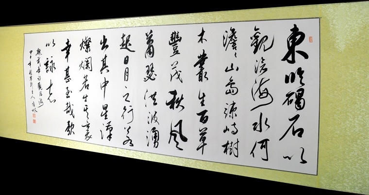 第一字画网的草书观沧海,适合挂在家里的客厅,或公司的办公室等场合,这幅草书观沧海装裱后长度约在2.2米左右,作品清秀洒脱,如果放在画廊出售,彩墨轩主俊林老师此幅草书观沧海的标价大约在1000元左右。