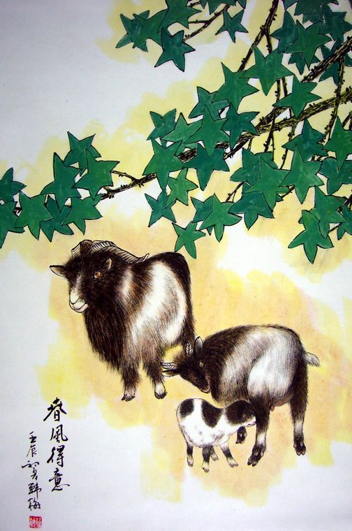 第一字画网的国画三羊图,这幅竖幅的三羊图装裱后长1.6米左右,是一副非常喜气的作品,作品画风细腻、栩栩如生,寓意三羊开泰,挂在家里卧室、书房或客厅都是非常不错的选择,亦可用作送礼等场合,如果放在画廊出售,韩梅老师此幅国画三羊图的标价在1000元左右。