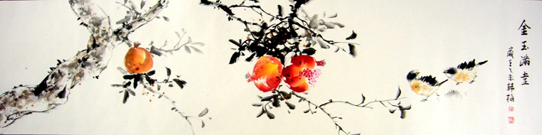 第一字画网的国画石榴图,是韩梅老师的四尺对开水墨作品,作品寓意金玉满堂,画面中涌动着生机和朝气,是一幅水准出色的吉祥作品,适合挂在家里的客厅或是公司的会客室等场合,也可以作为送礼的画作。如果放在画廊出售,画家韩梅此幅国画石榴图的标价大约在1200元左右。