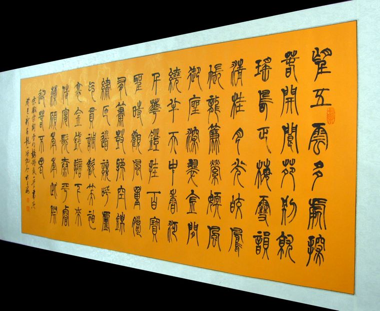 第一字画网雪明鹊夜慢书法,适合挂在公司的会客室,或是家里的客厅,这幅四尺书法是书法名家张纯启老师的篆书作品,装裱后长度约在1.8米左右,这幅篆书作品笔法老练,如果放在画廊出售,张纯启老师此幅名家篆书的标价大约在8000元左右。