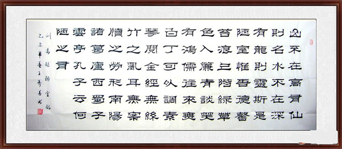 第一字画网的六尺陋室铭隶书作品,是用隶书书法完成的刘禹锡传世经典名篇,这幅小六尺的陋室铭隶书作品装裱后长度达到2.2米左右,作品笔法极其老练,布局合理,如果放在画廊出售,山东老书法家寿善老师此幅陋室铭隶书作品的标价在1800元左右。