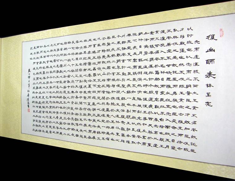 第一字画网的四尺后出师表书法,已完成装裱。这幅书法作品前出师表裱后尺寸达到1.8米长,从这幅书法诸葛亮传世名篇后出师表中看出作品笔法老练,清新秀丽,如果放在画廊出售,河南书法家林浩毅老师此幅后出师表书法的标价在1800元左右。