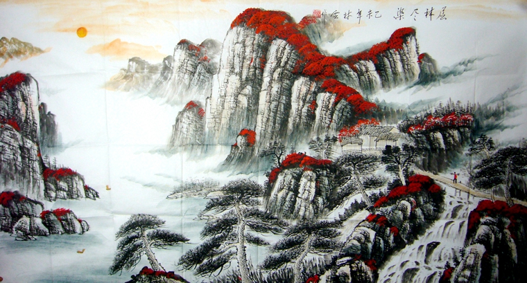 第一字画网的重彩山水,是幅挂在家里的客厅,或是公司的大型会议室。六尺山水画裱完后长度达2.2米左右,是一副大气磅礴的山水作品,作品意境生动、山水交汇,是副风水极佳的山水大作。如果放在画廊出售,林云老师此幅六尺横幅山水画的标价在2500元左右。作品功力深厚,构图气势磅礴,风水布局效果极佳,而且配以中国红的色彩,挂在家里的客厅或其他房间是非常不错的选择,能为自己和家人带来鸿运、财运。适合家居、办公,经商场所。为您带来滚滚财源! 愿每一片美丽的花瓣象征您闪耀的希望...借鸿运当头之红光,送您:一派辉煌,一派吉祥!