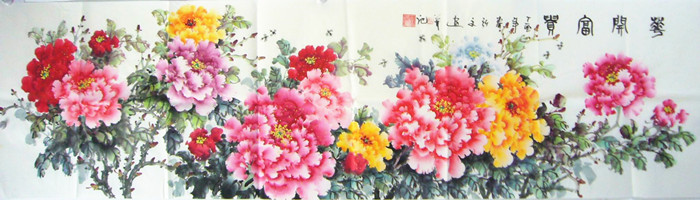 第一字画网的花开富贵牡丹图,作品裱完后尺寸近2.2米左右,是一幅水准出色的六尺对开作品,作品画风细腻、栩栩如生,挂在家里客厅或是送人都是非常不错的选择,挂客厅的话,特别适合挂在客厅沙发的背景墙,喜气十足、富贵满堂。如果放在画廊出售,弘文老师此副六尺对开花开富贵牡丹画的标价在3000元左右。欧阳修赞牡丹曰:“天下真花独牡丹”,牡丹花是富贵和荣誉的象征。