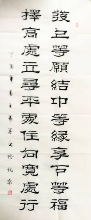 寿善老师1947年出生,现为中国书法家协会山东分会会员、山东省民族书画院常务理事、中国书画人才研修中心高级研修员、中外华人书法艺术家协会副会长。其隶书博取众家之长,融会贯通,形成自己的独特风格,书风俊秀,大气磅礴。作品多次在省、市电视台专题报道,多次在报刊上发表,并在书法比赛中多次获奖,如在《建国45周年名人书画展》、一至四界《国际书法展》等各大展事中屡获嘉奖。90年代后期潜心于研究与美术教育。作品常发表于《书法通讯》、《书法导报》、《中国文房四宝》等专业报刊。传略入编《中国美术书法家作品大画册》、《中国书画名人作品集锦》等十余部大型典籍。