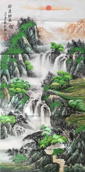 第一字画网的竖幅聚财山水画,这幅四尺的聚财山水画尺寸近1.8米左右,是一幅大气磅礴的四尺山水作品,作品雄浑苍劲,清新秀雅,布局合理、气势磅礴,这幅山水美景视觉效果上佳。如果放在画廊出售,刘淋老师此幅聚财山水画的标价在3000元左右。