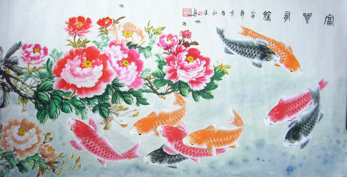 第一字画网新上架的富贵有余牡丹九鱼图,工笔画牡丹九鱼裱完后尺寸近1.8米左右,是一副非常清新的富贵有余图片作品,作品画风细腻、栩栩如生,牡丹和九鱼的布局相得益彰,九鱼图寓意着长长久久,吉祥如意,挂在家里客厅或是送人都是非常不错的选择,如果放在画廊出售,弘文老老师此副富贵有余牡丹九鱼图图片的标价在2000元左右。“鱼”与“余”谐音,鱼则象征着富贵,所以中国吉祥图案中常有鱼的图案。九鱼图中,“九”取长长久久之意,“鱼”取其万事如意,寓意年年有余,富贵有余。