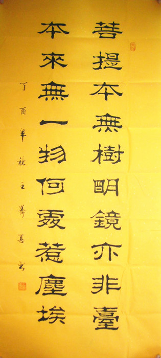 第一字画网的六祖慧能的禅悟书法,适合挂在公司的办公室,或是家里的书房,这幅手写毛笔隶书书法作品是寿善老师的作品,装裱后长度约在1.5米左右,办公室书法字画作品笔法老练苍劲大气,寿善老师此幅六祖慧能的禅悟办公室书法字画的标价大约在1500元左右。