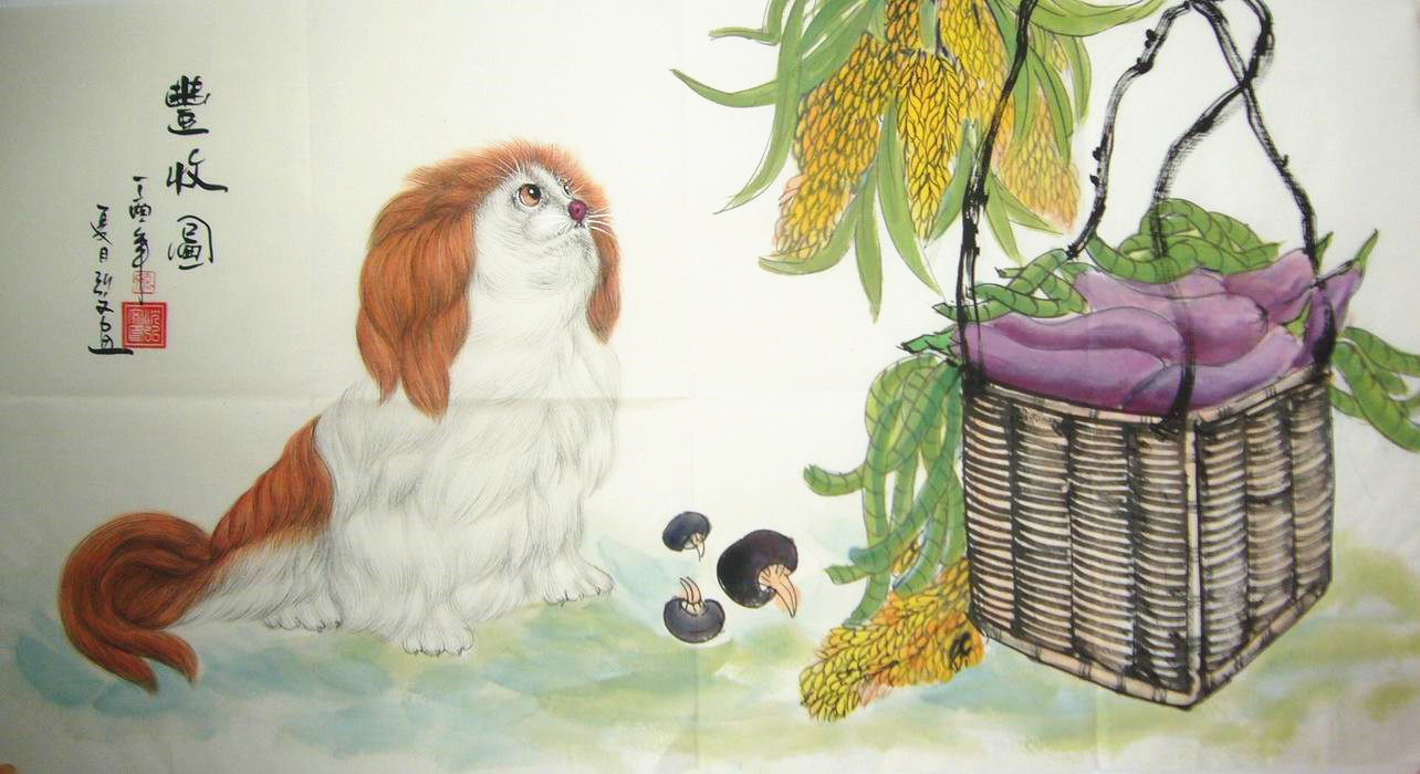 第一字画网的三尺动物画旺财,这幅三尺写意国画动物画裱完后尺寸近0.8米,是一幅水准上佳的作品,作品画风细腻、栩栩如生,玉米、茄子等农作物代表秋天的收获,小狗又叫旺财,两者结合起来寓意丰衣足食、富贵吉祥。挂在家里客厅、玄关或是送人都是非常不错的选择,如果放在画廊出售,沈弘文老师此幅写意国画动物画的标价在2000元左右。此幅优秀画动物画秋实作品,仅售780元,从作品的画面的细节处可以看出弘文老师的画功十分了得,适合挂在家里的客厅,喜气吉祥、富贵满堂。