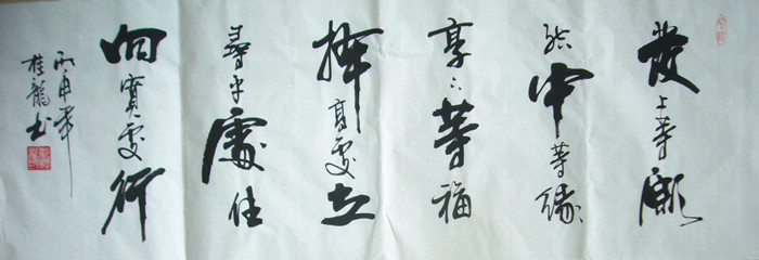 第一字画网的左宗棠名言书法发上等愿,是幅适合用作办公室场合或书房的书法作品,这幅行书书法是湖北书法家郁桂龙老师的作品,装裱后尺寸为1.5米长,如果放在画廊出售,桂龙老师此幅人生名句书法作品的标价大约在1000元左右。