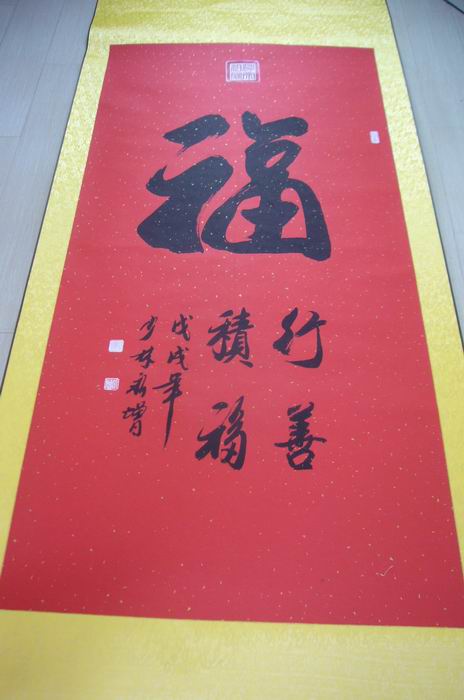 释永增大师对书法艺术的追求,释永增历来是虔诚而执着的,不求功利,对每幅书法的创作也是认真而严谨的,尽量完美,他十分重视作品的整体神韵和章法的随意成妙,他的行草书格调高雅、自然洒脱、点划精到;行书笔力遒劲、气韵畅达、意趣横生。如果放在画廊出售,释永增大师此幅四尺名家书法福字的标价大约在25000元左右。
