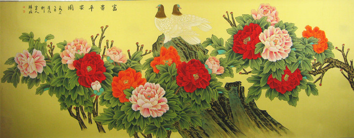 第一字画网的工笔花鸟画富贵牡丹图,小八尺客厅字画牡丹图裱完后的长度达到2.8米左右,作品虚实结合,突出主题,栩栩如生。大尺寸的工笔牡丹图比较少见,牡丹寓意着富贵吉祥,涌动在画面中得气息,画面中得白鸽代表着和平,两者结合寓意富贵平安,此幅牡丹花鸟画作品挂在家里客厅或是送人都是非常不错的选择,如果放在画廊出售,韩梅老师此幅八尺工笔画和平鸽牡丹画的标价在7000元左右。