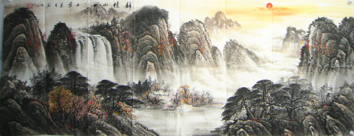 第一字画网的办公室风水国画国画山水画《锦绣山河》裱完后尺寸近2.2米左右,是一幅大气磅礴的小六尺山水,作品意境生动、山水交汇,清新秀雅,布局合理,视觉效果上佳,看作品的气势、云层和山脉的细节,就能看出老师的深厚画功,画面上的红日寓意着鸿运高照,如果放在画廊出售,刘淋老师此幅山水画泰山日出的标价在5000元左右,作品的气势和画功都是一流的,适合挂在客厅、或公司的会议室等场合。