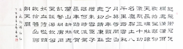 第一字画网的隶书作品满江红,是用隶书完成的岳飞经典诗词,这幅六尺对开的隶书作品满江红装裱后长度达到2.2米左右,作品笔法老练,工整大气,适合挂在家里的客厅或会客室等场合,如果放在画廊出售,山东书协寿善老师此幅隶书作品满江红的标价在1500元左右。