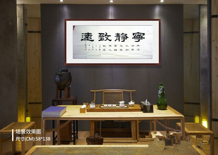 第一字画网的四尺书法宁静致远,这幅书法是山东书法家协会寿善老师的隶书作品,适合挂公司办公室或家里的书房,装裱后长度约在1.8米左右,作品笔法老练,如果放在画廊出售,寿善老师此幅四字书法宁静致远书法裱完后的标价大约在1400元左右。