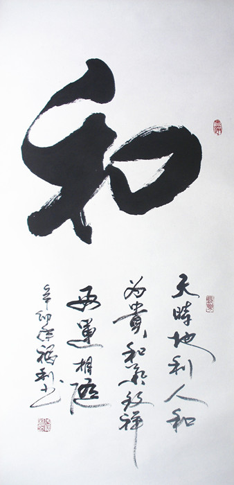第一字画网的书法作品《和》,这幅书法是山东书法家协会福利老师的书法作品,装裱成轴后长度约在1.5米左右,可以直接悬挂,作品笔法老练,小字为:天时地利人和为贵,和气致祥好运相连。如果放在画廊出售,福利老师此副书法作品和字裱完后的标价大约在1000元左右。
