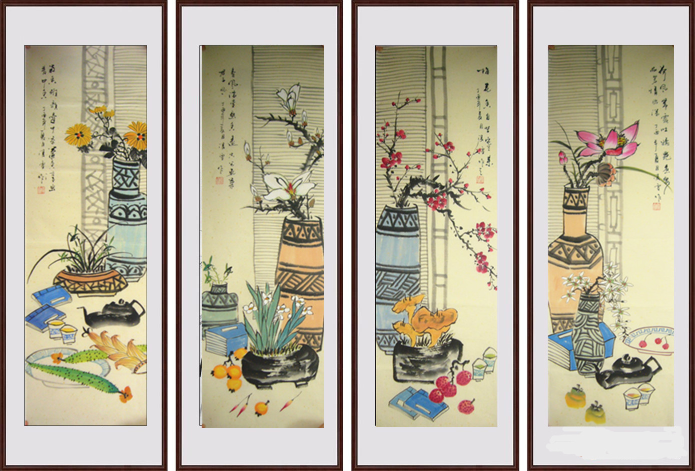 第一字画网的春夏秋冬四季花鸟画,这幅春夏秋冬四季花鸟画单幅画装裱后长1.5米左右,是一副非常温馨的作品,作品画风细腻、栩栩如生,十分雅致。挂在家里客厅或玄关都是非常不错的选择,亦可用作送礼等场合,如果放在画廊出售,凌雪老师此副春夏秋冬四季花鸟画标价在5000元左右。