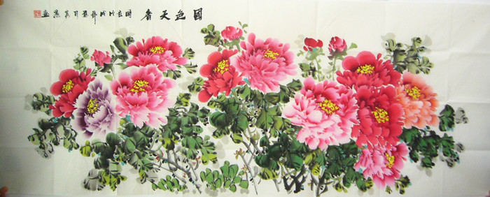 第一字画网的国画牡丹图《国色天香》作品若裱完后的长度达到2.2米左右,是一幅刚到的牡丹佳作,作品画风细腻、栩栩如生,牡丹寓意着富贵吉祥,作品上又写着国色天香四个字,挂在家里客厅或是送人都是非常不错的选择,如果放在画廊出售,此幅六尺牡丹成品的标价起码在2000元左右。