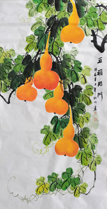 第一字画网的吉祥花鸟画葫芦图 ,这幅四尺的葫芦作品裱完后长度近1.8米左右,是一幅水准上佳的作品,作品画风细腻、栩栩如生,葫芦和福禄谐音,挂在家里客厅或是送人都是非常不错的选择,如果放在画廊出售,谭佰川老师此幅国画葫芦的标价在1800元左右。