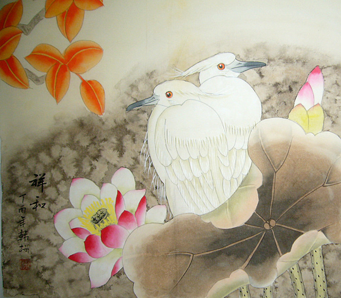 • 产品简介: 斗方莲花花鸟图,韩梅老师作品。