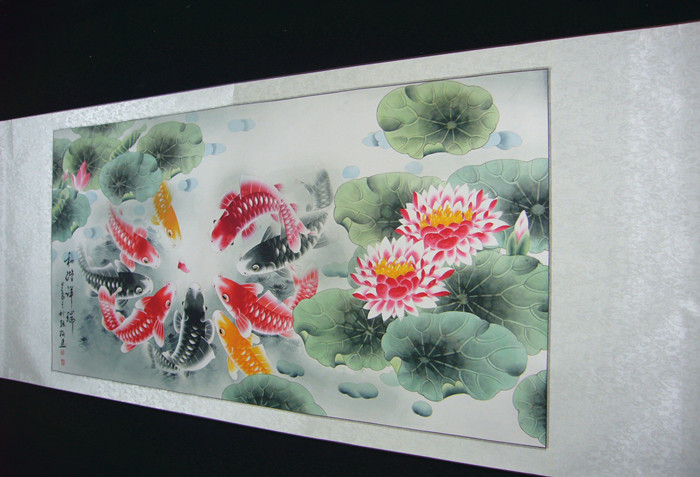 第一字画网的国画精品九鱼图,这幅四尺的工笔画九鱼图装裱后长1.8米左右,是一幅非常有灵气的作品,九鱼图寓意长长久久、连年有余,作品题字为花开有余、富贵呈祥,点出了这幅作品的主题,挂在家里餐厅或客厅都是不错的选择,作品立意清新,构图巧妙,用笔简练,刻画得惟妙惟肖,匠心独具。如果放在画廊出售,韩梅老师此幅国画精品九鱼图的标价在2500元左右。