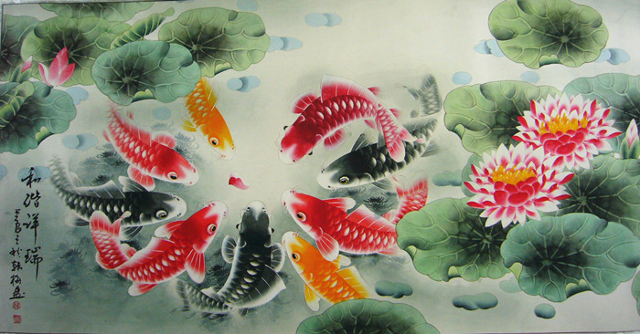 客厅字画荷花九鱼图
