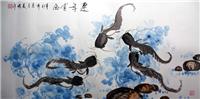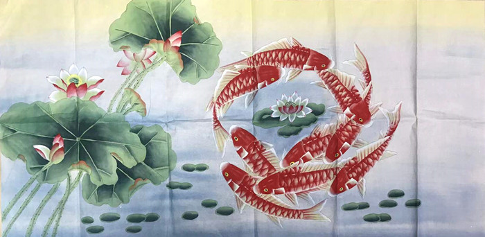 第一字画网的工笔荷花九鱼图,这幅四尺工笔荷花九鱼图装裱后尺寸为1.8米左右,是一幅非常温馨的作品,作品画风细腻、栩栩如生,十分雅致。挂在家里客厅或公司的会客室都是非常不错的选择,亦可用作送礼等场合,如果放在画廊出售,诸葛明科老师此幅工笔荷花九鱼图的标价在3000元左右。