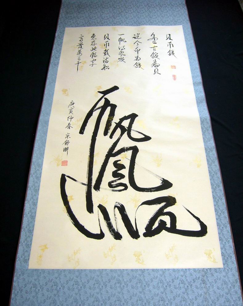 • 产品简介: 风水招财艺术佳作一帆风顺,山东书协名家宋舒耕老师特色书法,四尺作品,撒金宣纸,仅一副。