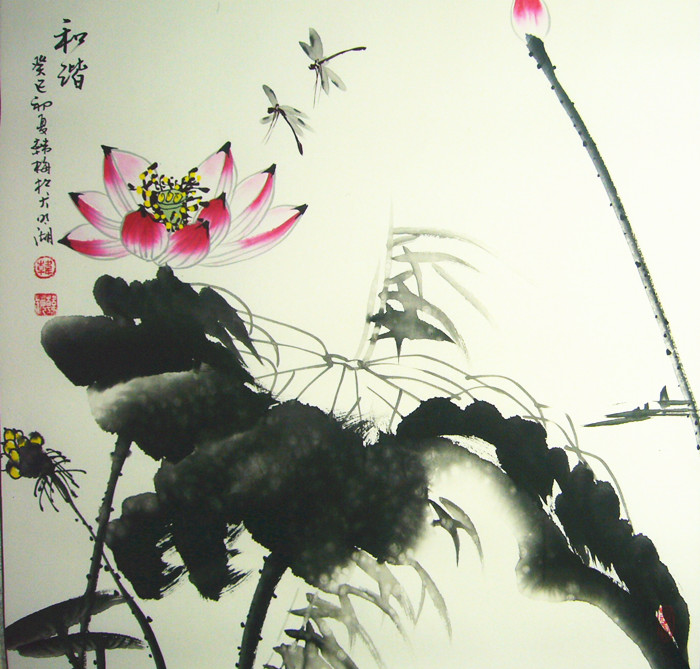 • 产品简介: 池塘荷花图,画家韩梅四尺斗方工笔画,已装裱。