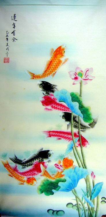 第一字画网的家居九鱼图,这幅四尺的工笔九鱼作品裱完后尺寸近1.8米左右,是一幅非常清新的作品,作品画风细腻、栩栩如生,九鱼图寓意着长长久久,吉祥如意,挂在家里客厅或是送人都是非常不错的选择,如果放在画廊出售,王美琦老师此幅家居九鱼图的标价在1200元左右。“鱼”与“余”谐音,鱼则象征着富贵,所以中国吉祥图案中常有鱼的图案。九鱼图中,“九”取长长久久之意,“鱼”取其万事如意,寓意年年有余,富贵有余。